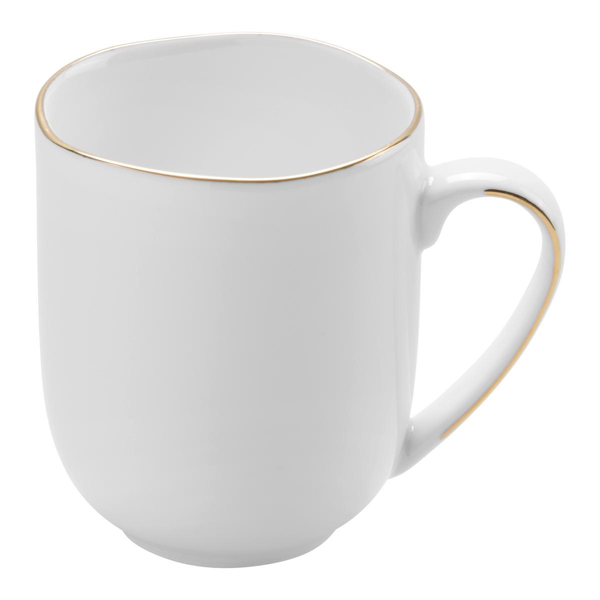 Entdecken Sie unseren exquisiten Kaffeebecher in zeitlosem Weiss mit goldfarbenen Akzenten! Mit einem Fassungsvermögen von ca. 350 ml ist dieser Becher perfekt für Ihren morgendlichen Kaffee oder Tee geeignet.